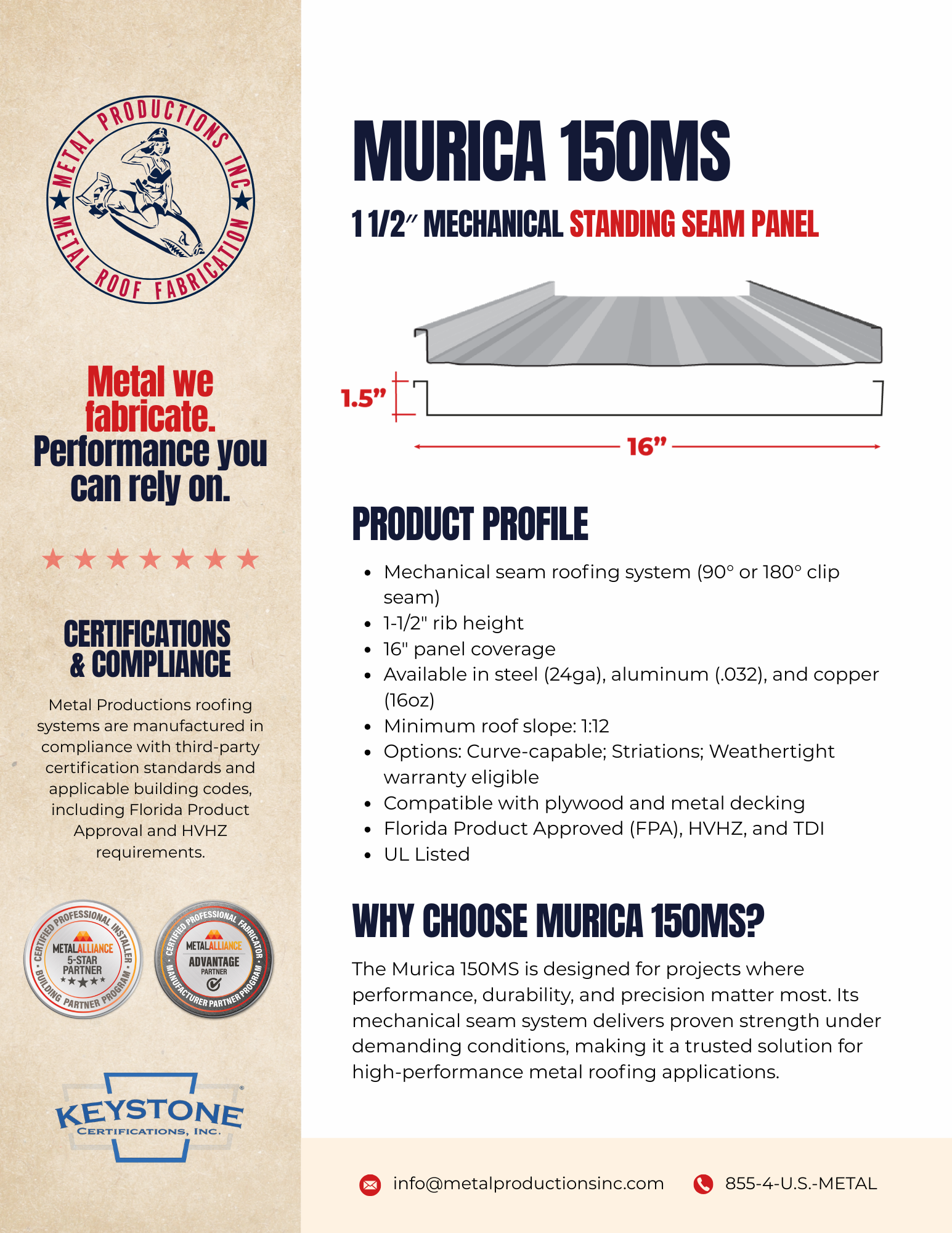 Available in 90° or 180° seams and in 24 Galvalume®, 0.320 Aluminum, and Copper 16oz options, the Murica 150 MS features a 16″ panel coverage and curve-capable configurations. Engineered for applications with a minimum slope of 1:12 and uplift pressure up to -218.8psf, tested to meet Florida Building Code, HVHZ, and Miami-Dade requirements, this panel is mission ready for contractors who demand the best.